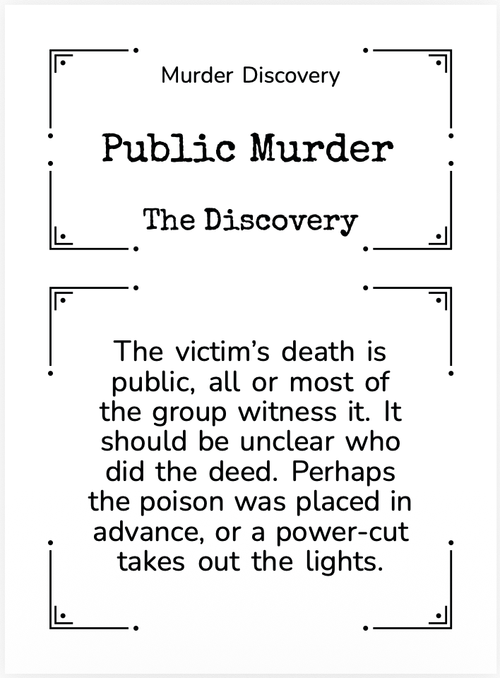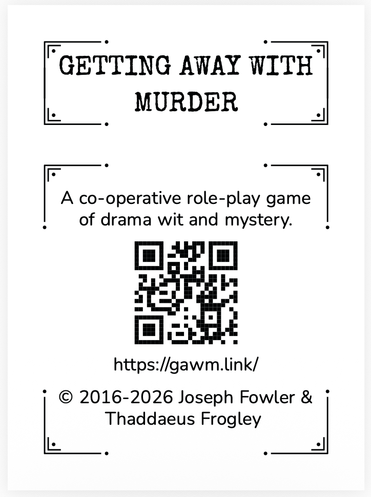 I ran a few Getting Away With Murder sessions, for friends and at open tables, and I am reminded of what a delight it is to play, and how quickly new players pick it up. My good friend Claire pressed me, again, on why I have not created a print edition yet.