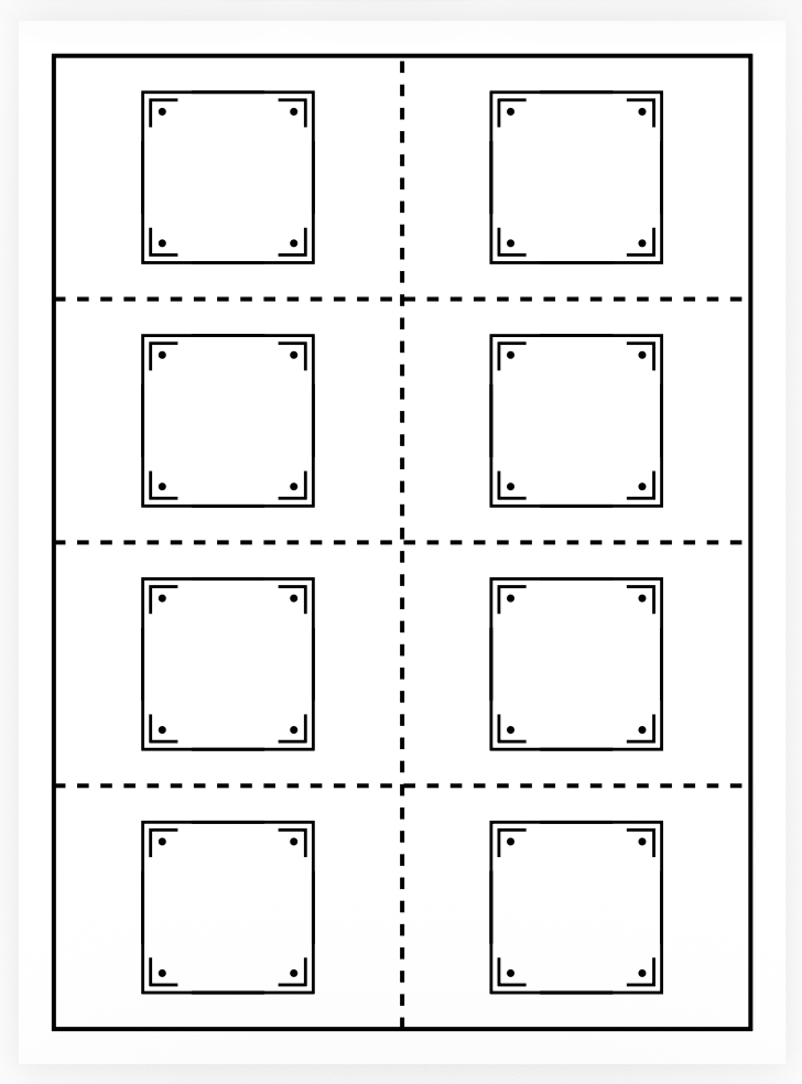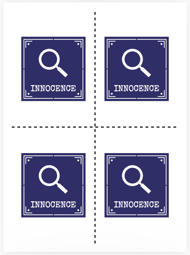 We add the innocent and guilt tokens (to be cut out) to the deck, initially 6 per card, but we switch to 4 per card later. I do some 2-sided test prints at home to check alignment. I am not confident about the flip direction for front and back for final print, so we settle on a token layout that should work flipped horizontally and vertically: