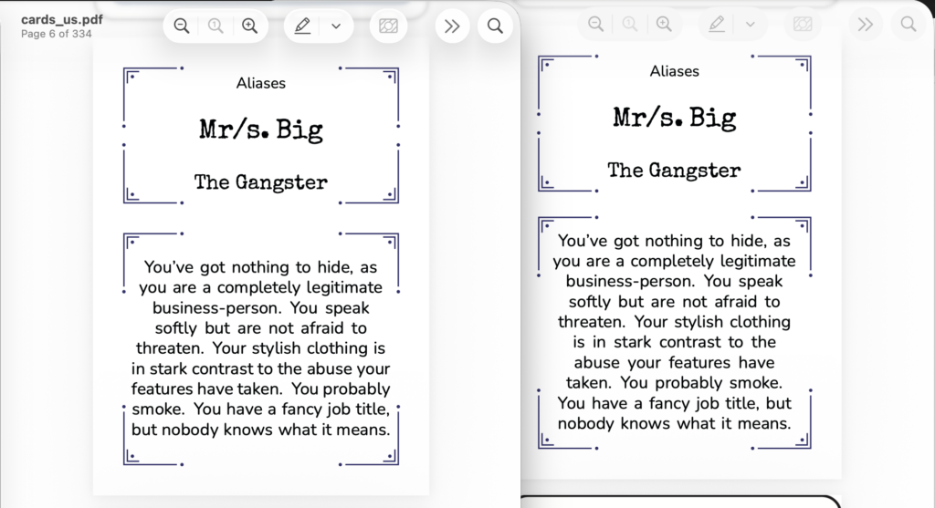 I explained it wasn’t really creative graphic design we needed help with, but the technical understanding of how to create a print-ready pdf, from playing card data we have as Json, formatted correctly for playing cards. Laying out over 150 cards by hand just didn’t seem like a sensible way to do this.