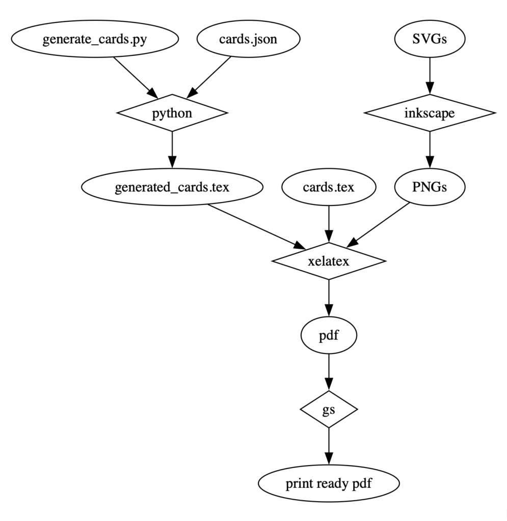 - existing cards text content json gets processed into latex commands using a short script written in python